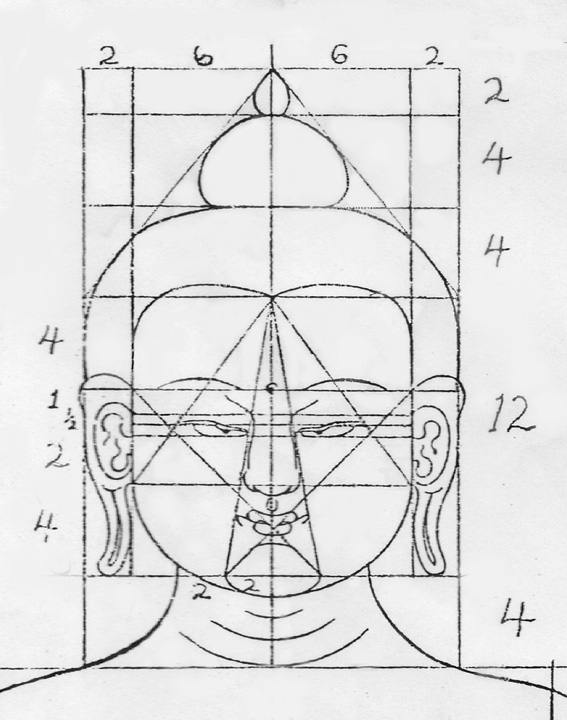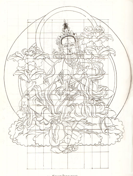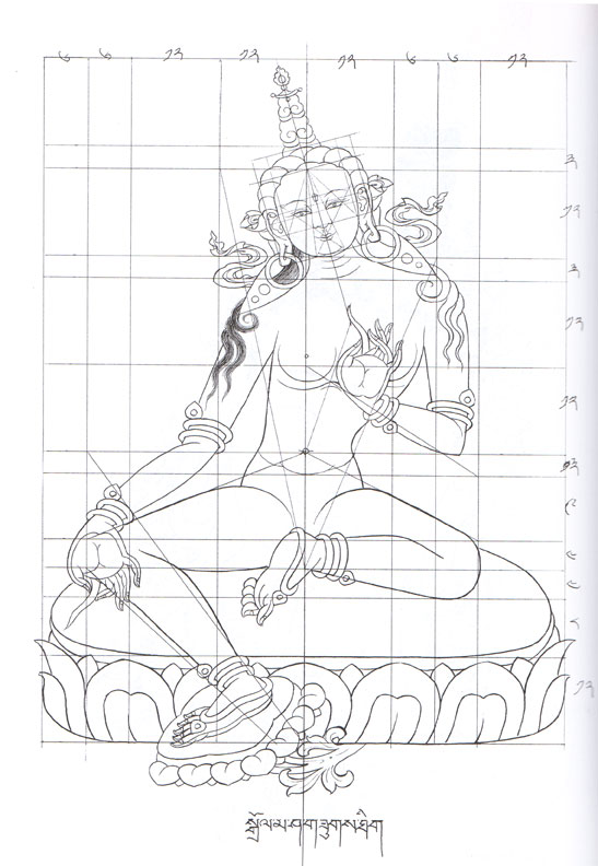 Tibetan iconography called tigtse in Tibetan is the sacred geometry of Tibet. Different classes of figures are divided into groups, each group has its own special measurements. Since all of Buddhism comes from the Buddha he is the largest measurement.
